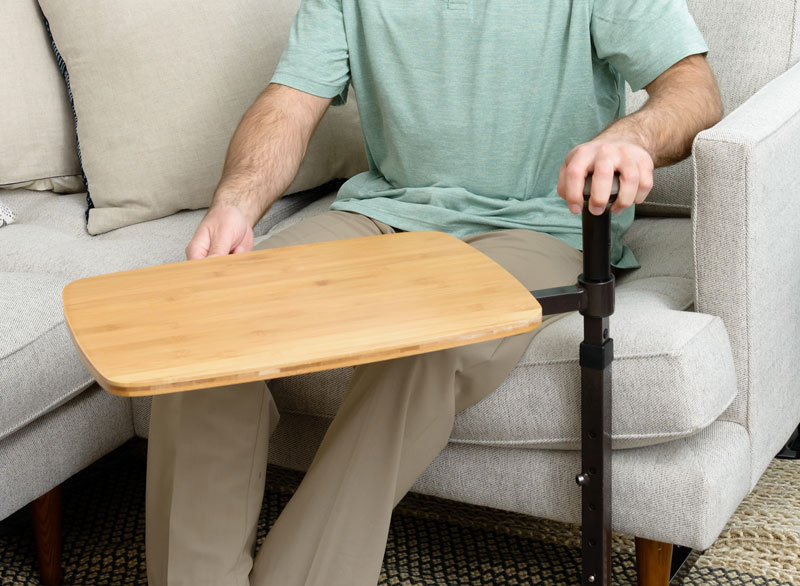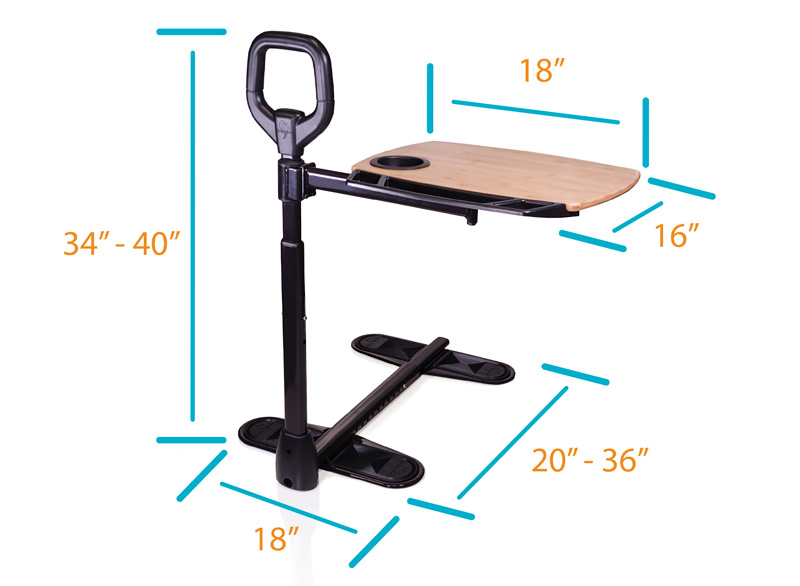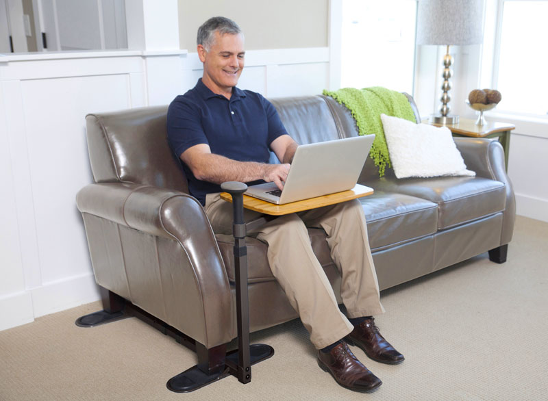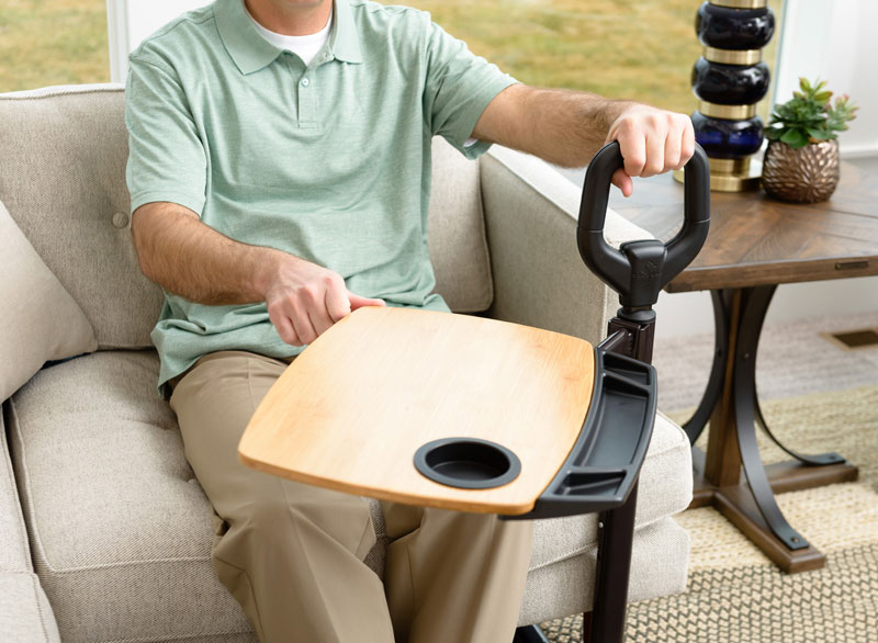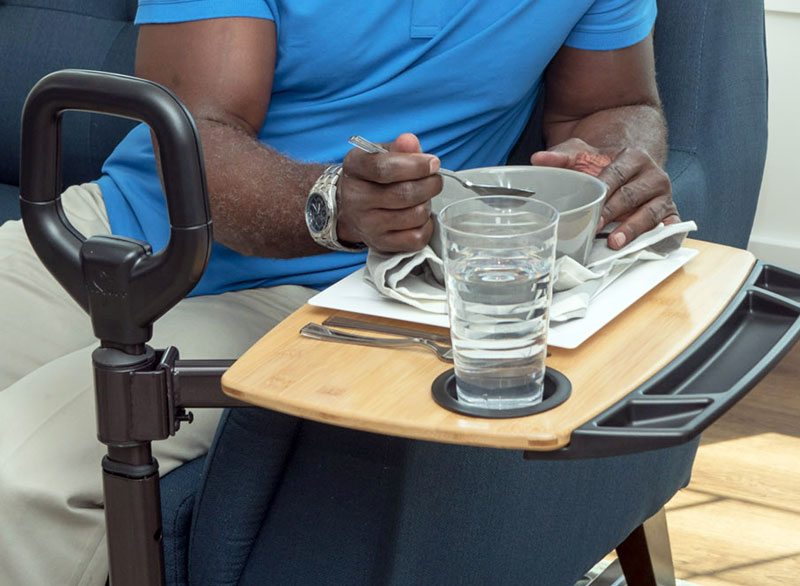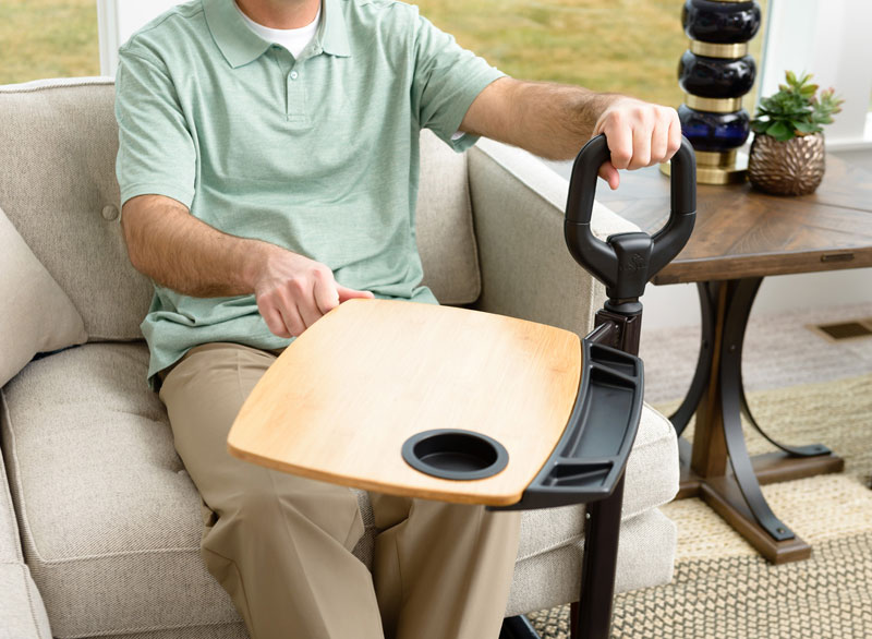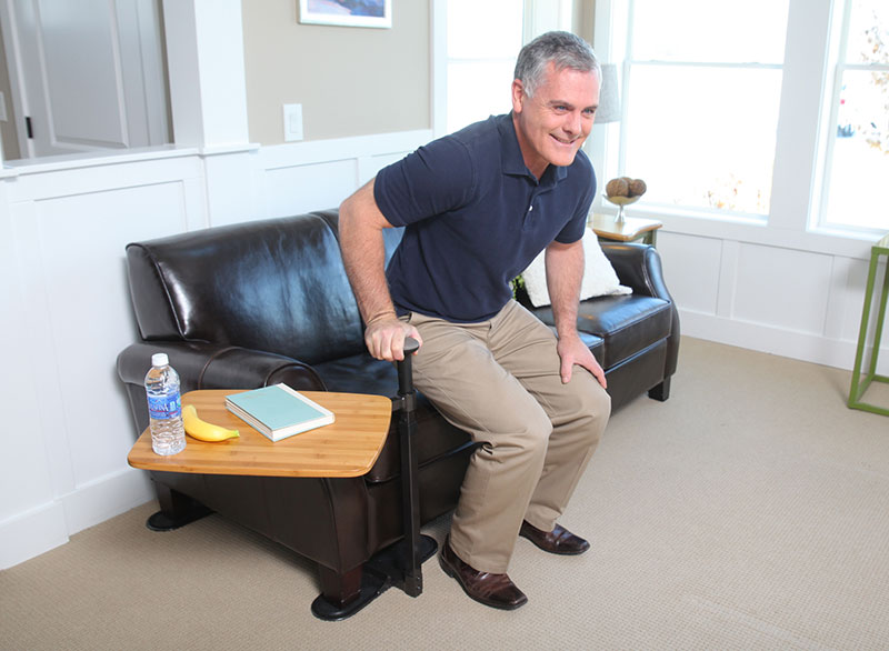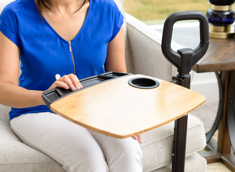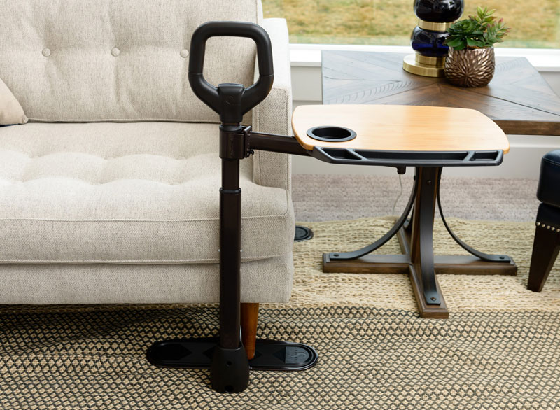 The Omni Tray is a couch-side handle and TV tray that makes it easy to stand from your favorite couch or chair. It comes with a convenient multi-use swivel tray so you can eat, surf the web, and even work from home from your own personal workstation. And like all of our products, it blends in with your living room like another piece of furniture so you can maintain the comforting feeling of your home.